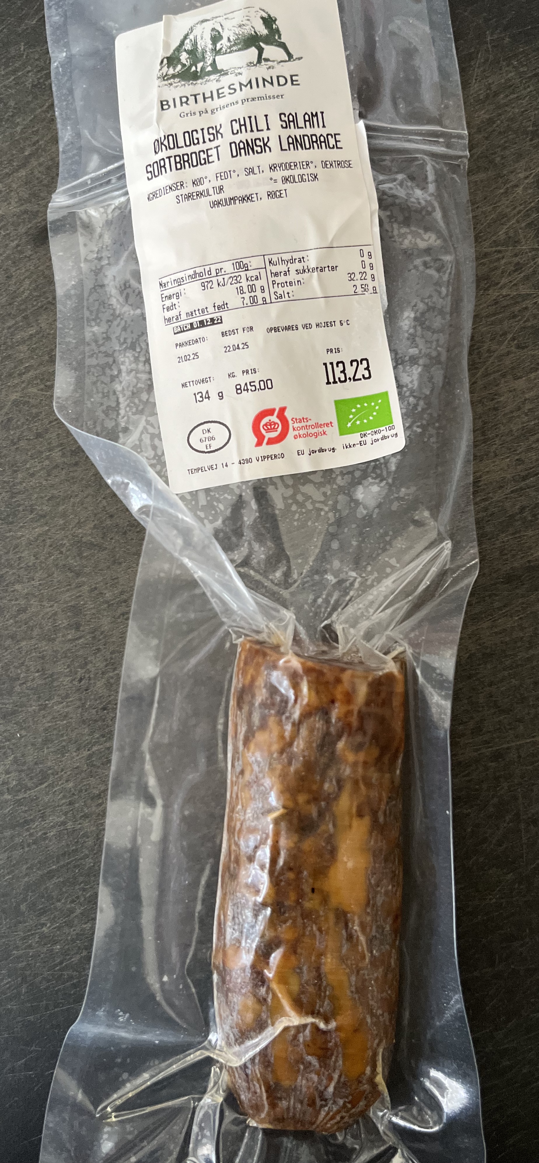 Røget chili salami af sortbroget dansk landrace: Ikke på webshop.