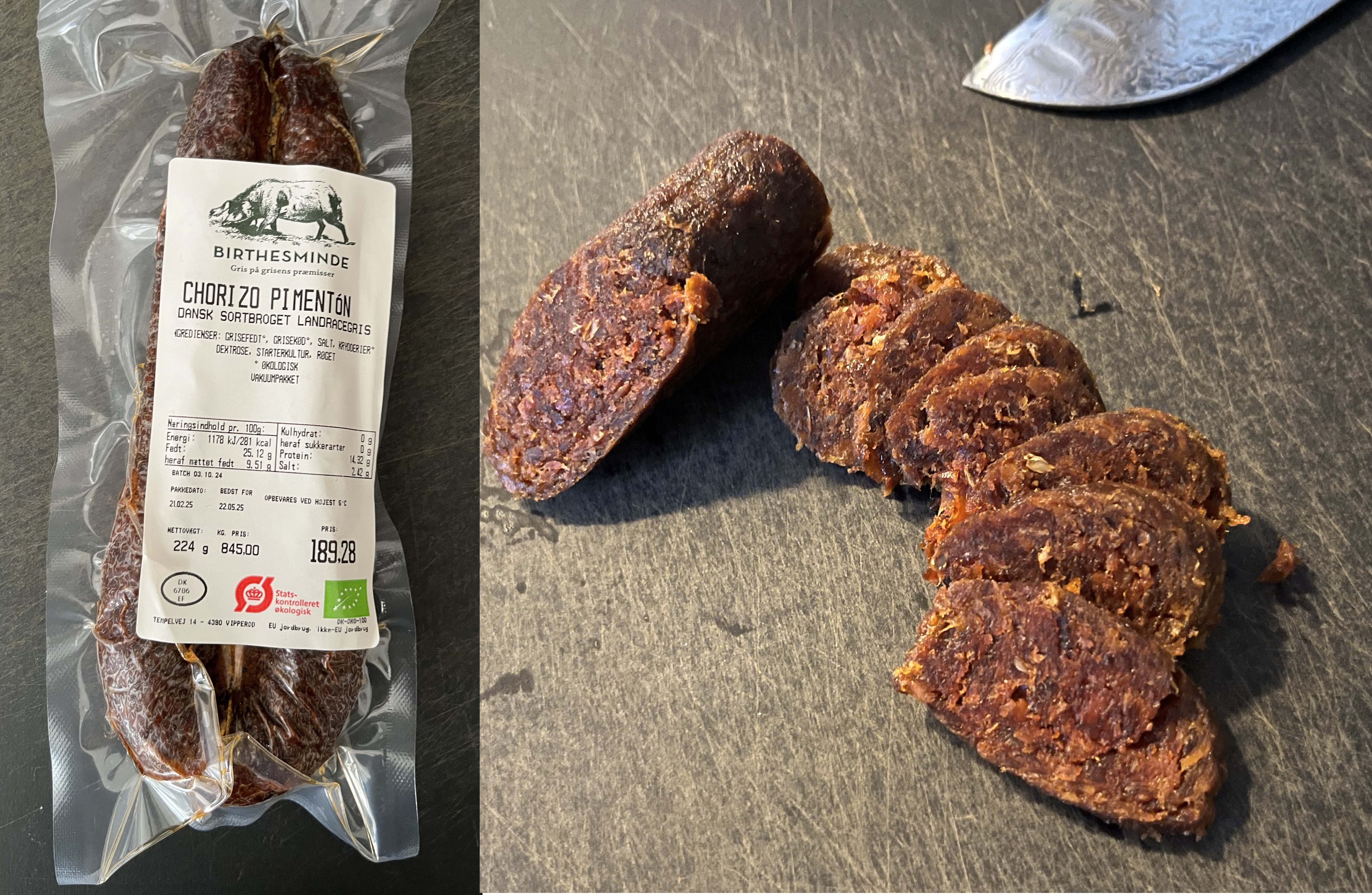 Snackpølse af broget dansk landrace: https://butik.birthesminde.dk/collections/charcuteri/products/kopi-af-chipolata-polse-okologisk