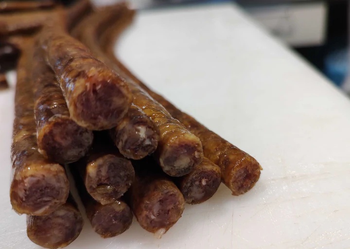Tynd mørk pølse. Fedtet udenpå. God i knækket og meget sprød. Perfekt godt knas, når man nemt bider den over, og en lækker kødsmag! Derudover sætter den sig ikke i tænderne, hvilket er virkelig rart.
