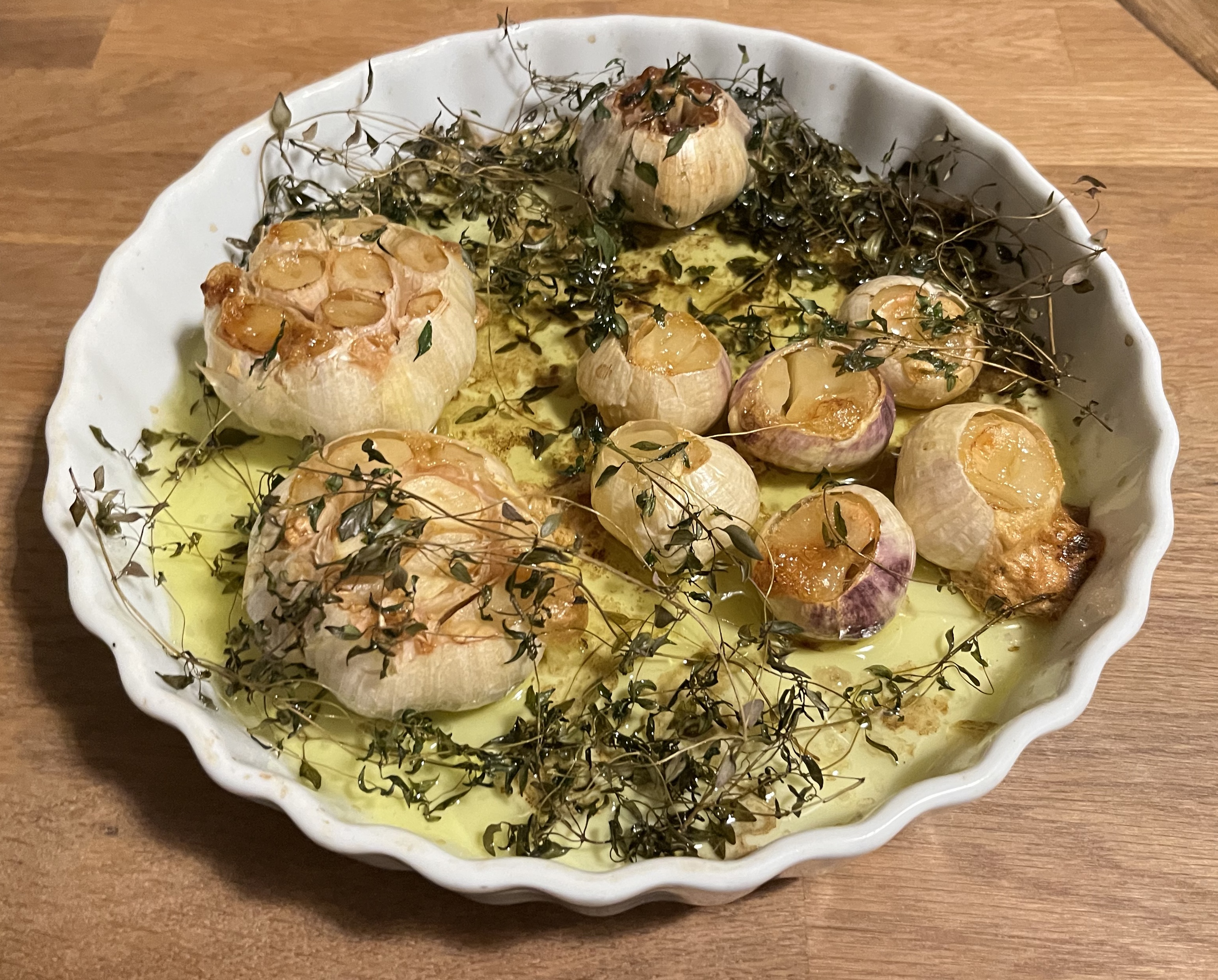De her hvidløg var fra efteråret og efterårshvidløg er typisk lidt stærkere end forårs-/sommer-hvidløg, så selvom styrken var aftaget gennem bagningen, så var det stadig en anelse stærkt. Så de her bagte hvidløg havde nok været bedre som en mindre tilbehørsret.