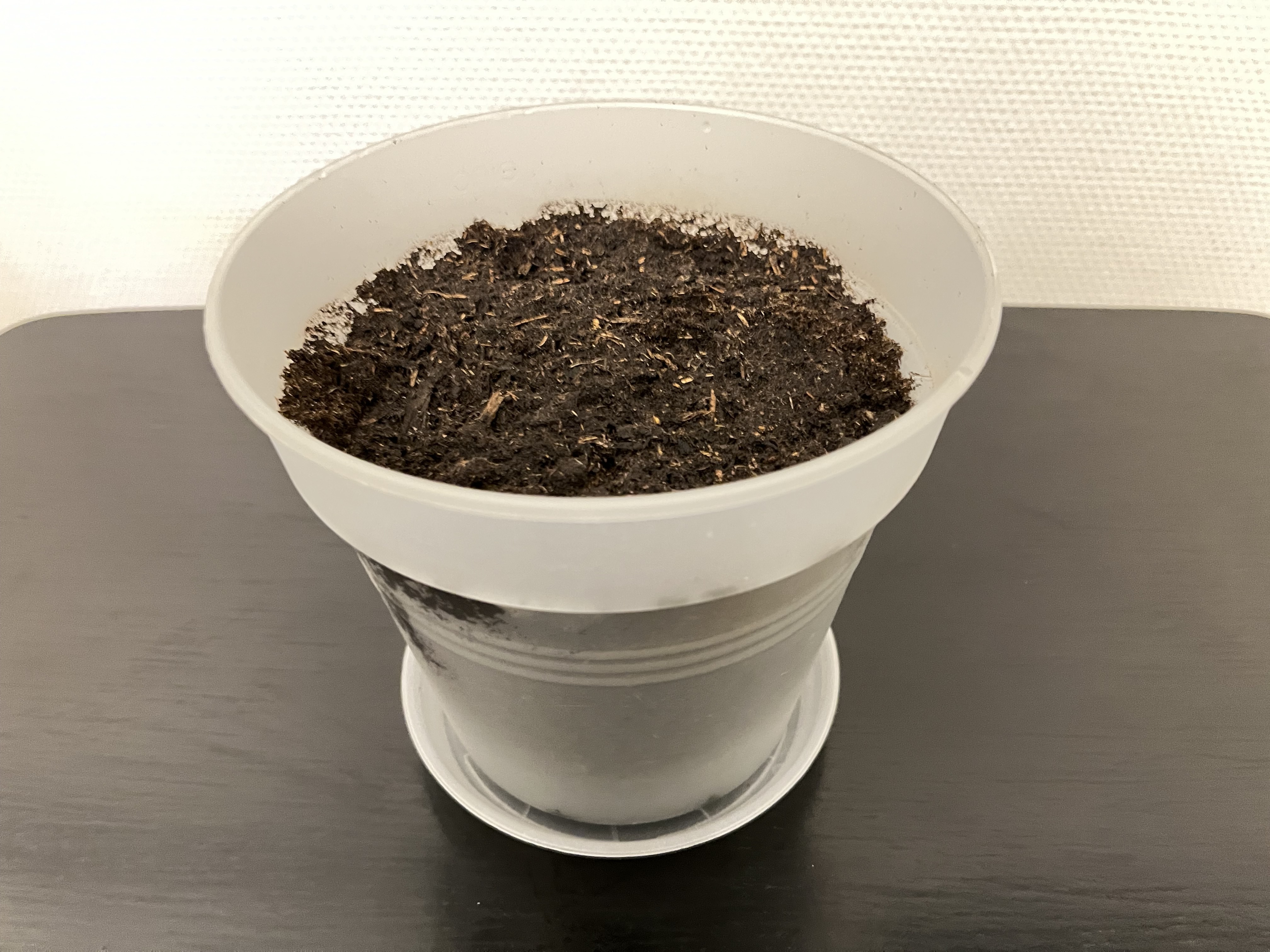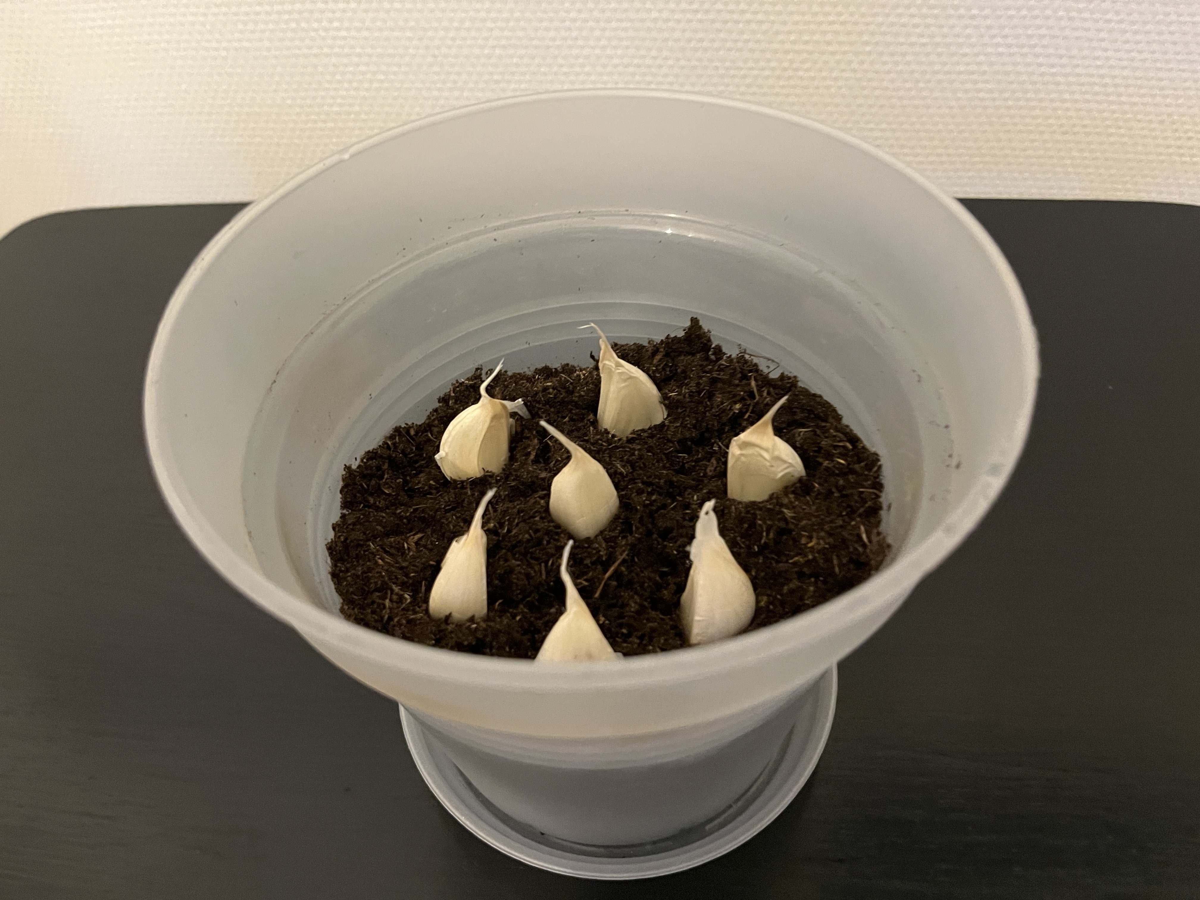 Som det ses på billederne, så blev hvidløgene spredt godt ud i potten og plantet 5 cm under toppen af jorden.